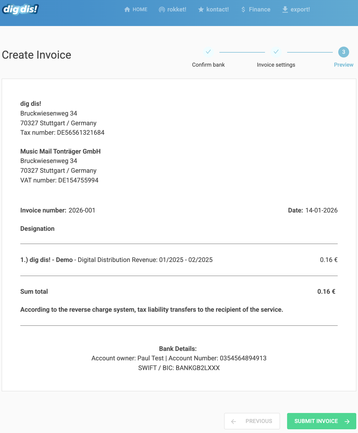 In the final step, you will see an overview of your invoice. Please review all details carefully and if everything is correct, submit the invoice.