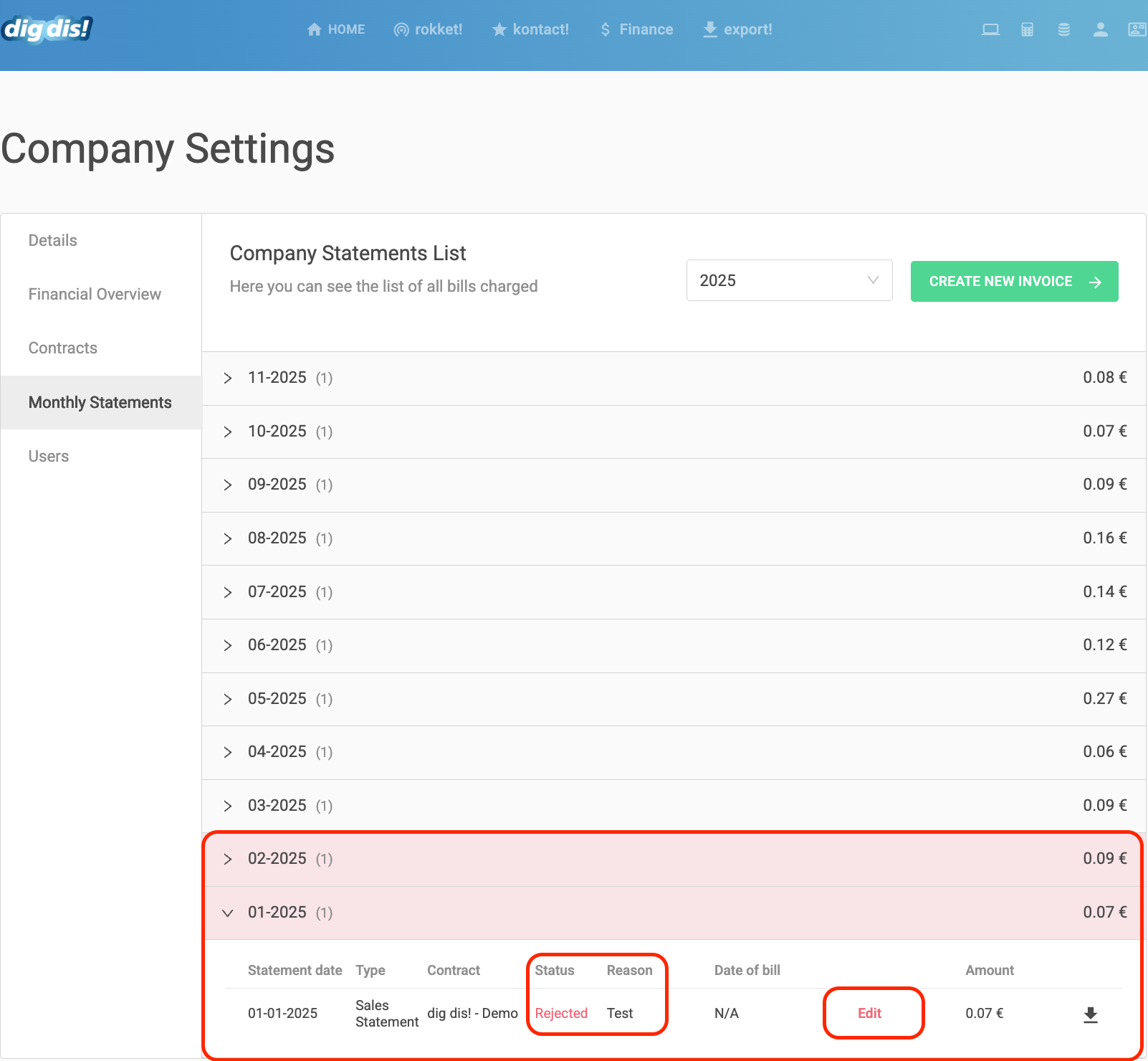 Please also pay attention to the invoice status. If an invoice is rejected for any reason, the reason will be shown there.
