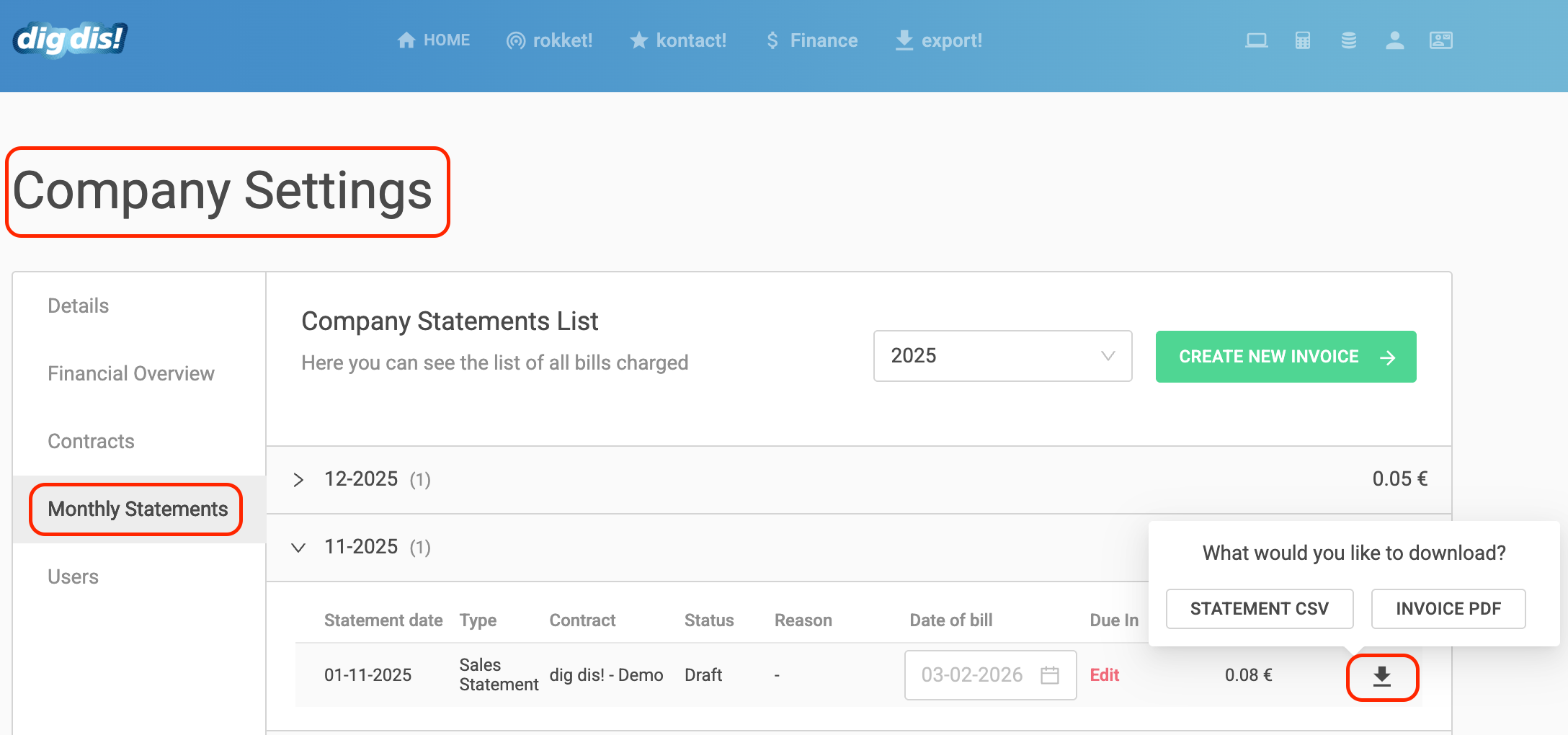 Under Company Settings / Monthly Statements, you will find an overview of all your statements.